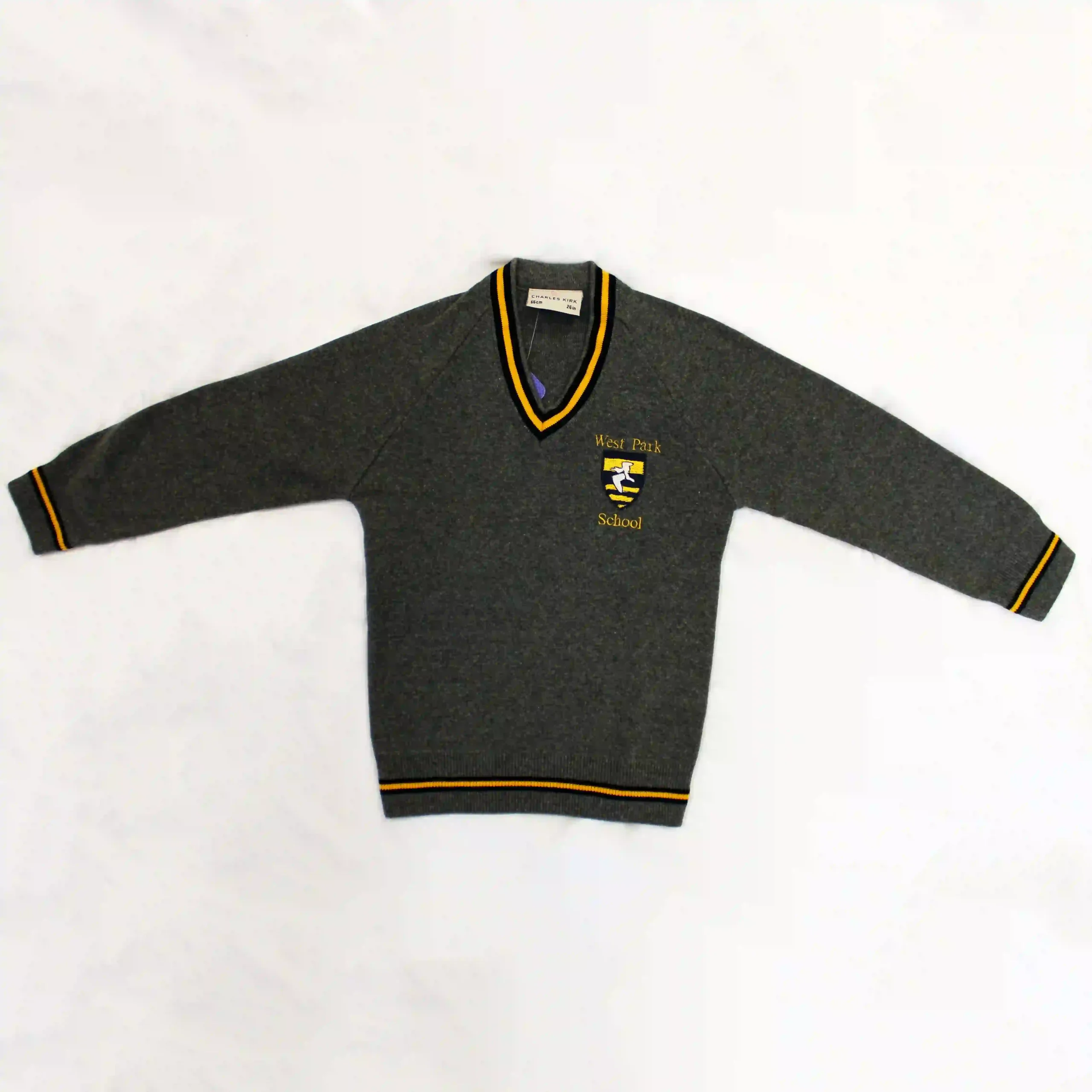 The West Park School jumper is a grey jumper with yellow and black details as well as the embroidered logo, designed for pupils of West Park CE Primary School.